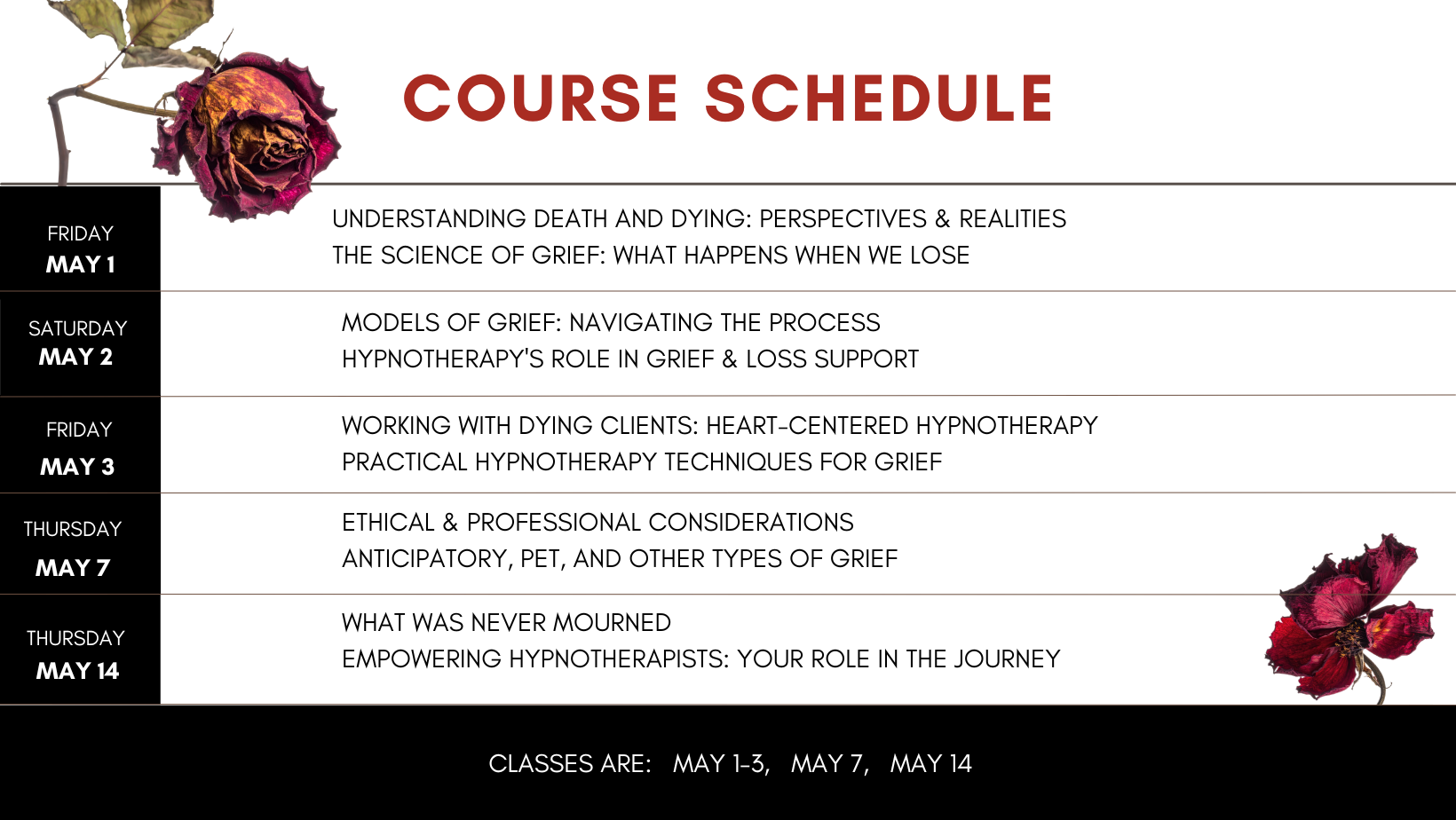 You will be guided through both the clinical and deeply human aspects of death, dying, end-of-life and grief support, integrating hypnotherapy with emotional, psychological, and energetic care.